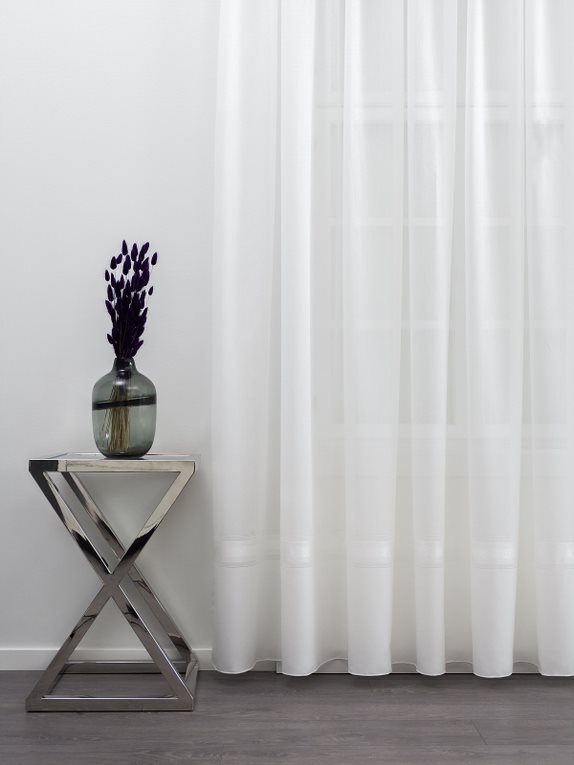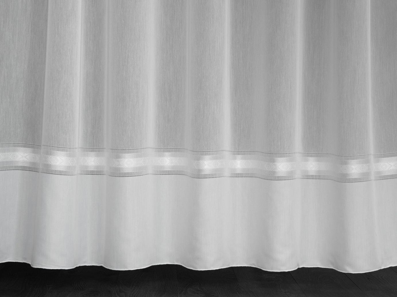 1 soron csillogó hímzéssel díszített függöny, fehér és ecrü színben. Vasaláskönnyített sablé jellegű anyag.