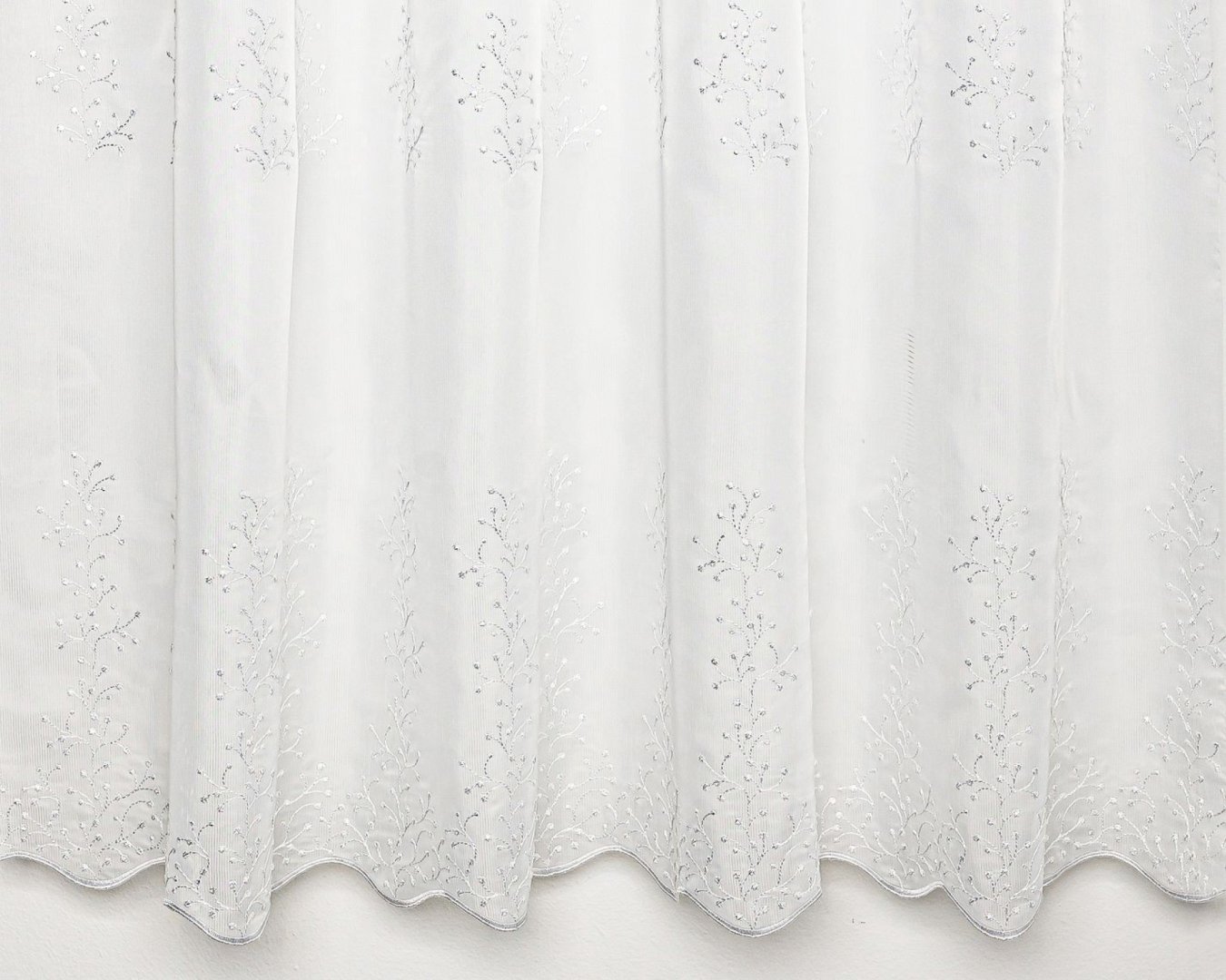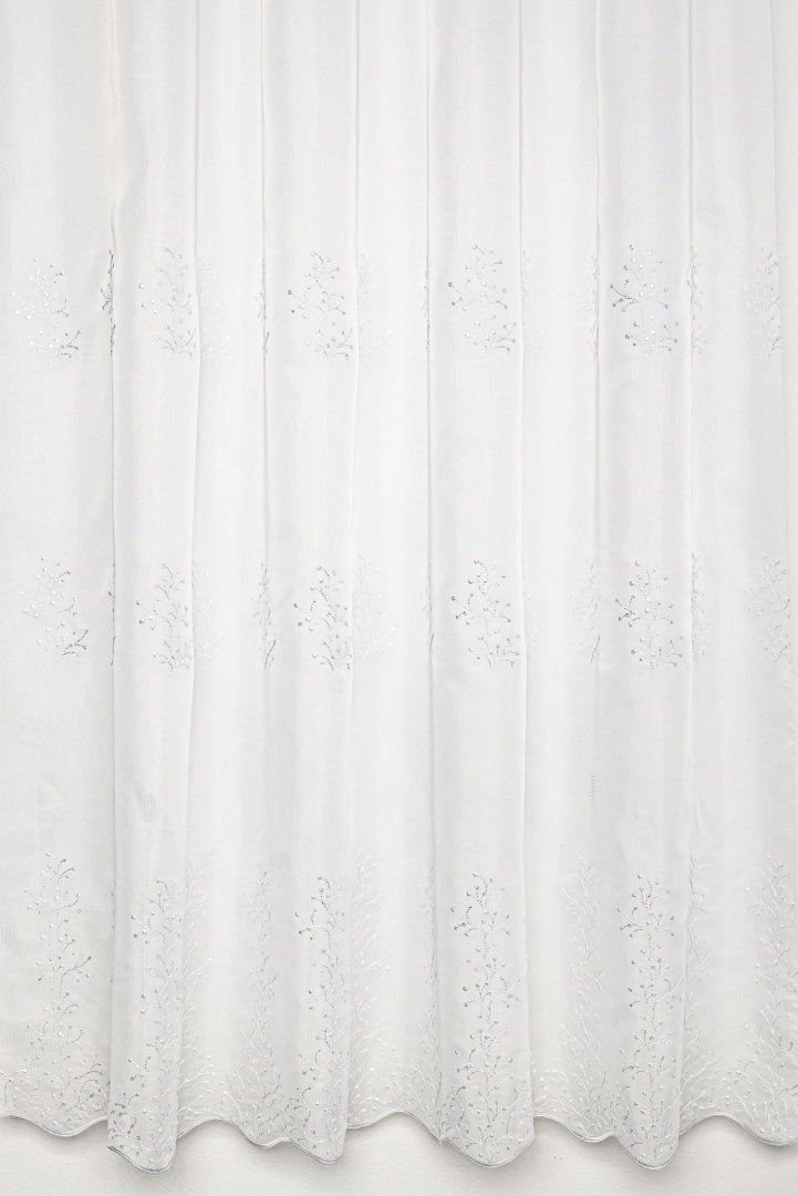 Három soron ágacska mintákkal hímzett függöny, fehér és ecrü színben. Hímzés 104 cm-ig.
