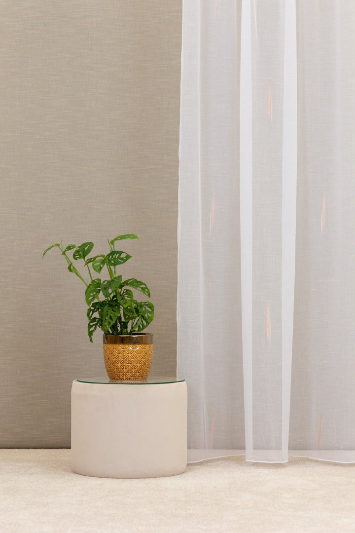 Ezüst vagy narancs színű apró mintákkal beszőtt sablé fényáteresztő függöny.