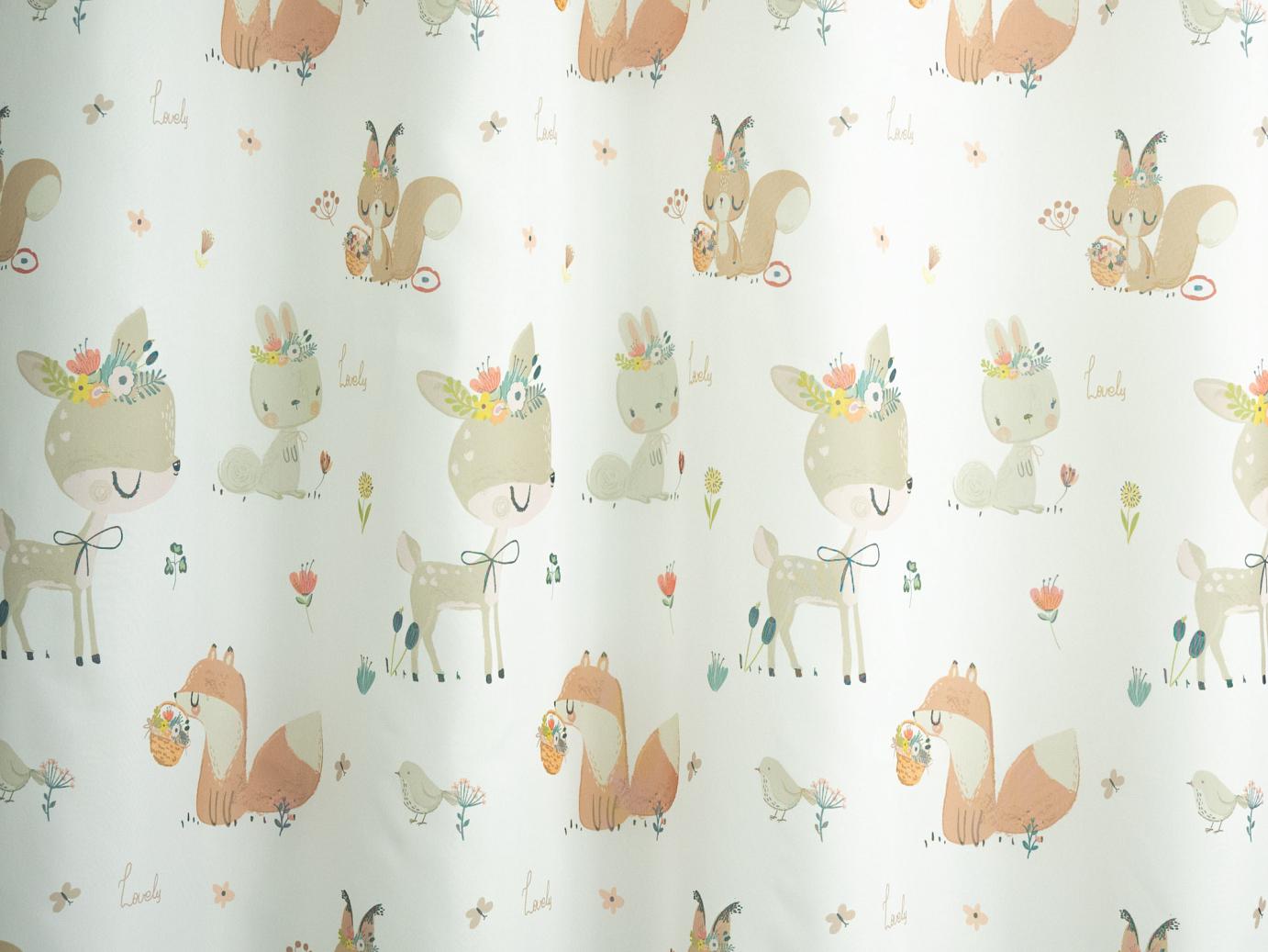 Igazi gyerekszoba függöny, legyen akár kislány, akár kisfiú a szoba gazdája. Cuki őzikével, nyuszival és rókával dekorált anyag.