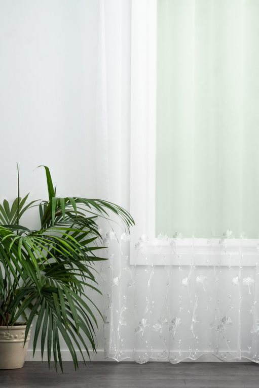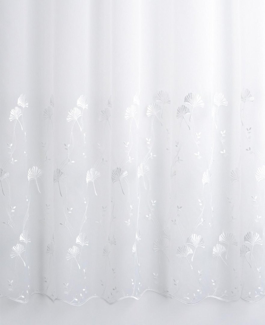 Alján virágokkal hímzett, vasalásmentes, hálósl alapú fényáteresztő függöny.