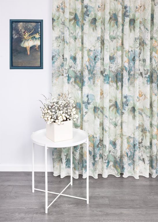 Nagyon egyedi virágos fényáteresztő függöny.Kellemes tapintatú, természetes alapra nyomott, festényszerű mintával díszített, vasalásmentes anyag.