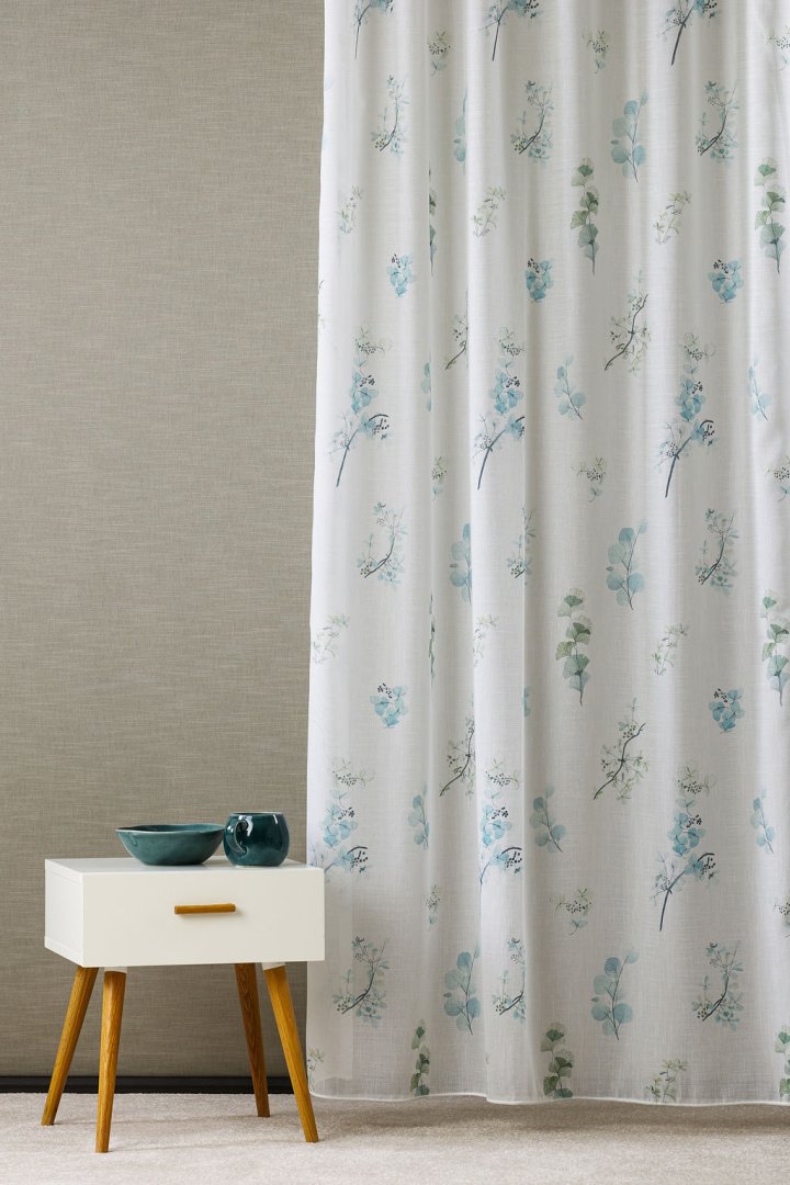 Vízkék ginko levelekkel díszített sablé függöny. Finom természetességet árasztó anyag, vasalásmentes és egyszerűen gyönyörű.