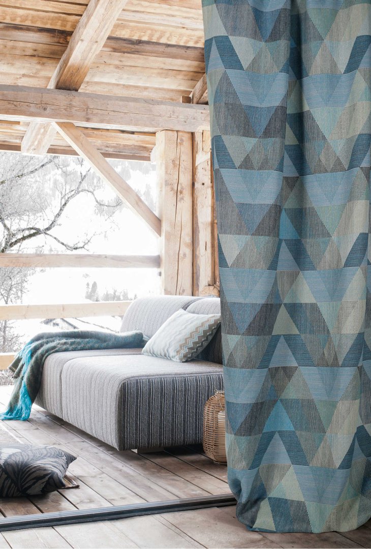 Igazán trendi geometriai mintás dimout dekor, kellemes kék színben, amely szürkével vagy barnával egyaránt jól kombináható.