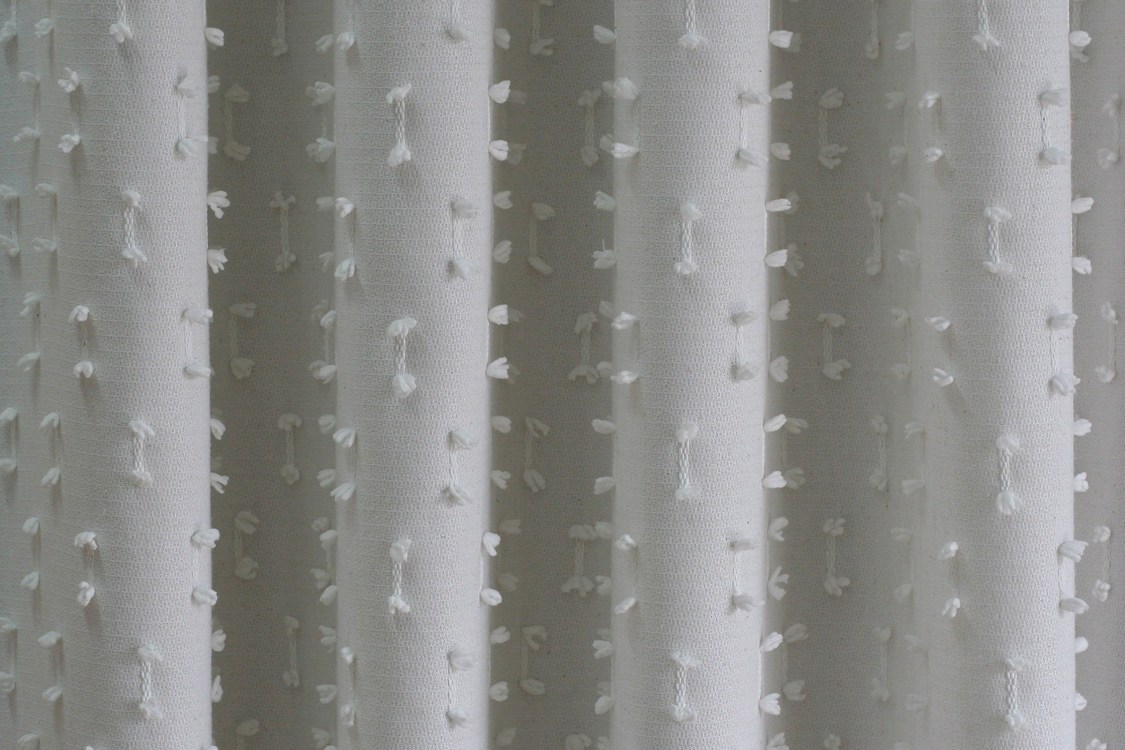 Törtfehér, puha tapintatú, természetes hatású dekorfüggöny. Nagyon ízléses, kicsi szövött rátétekkel díszített, ezért gyerekszobába tökéletes választás.
