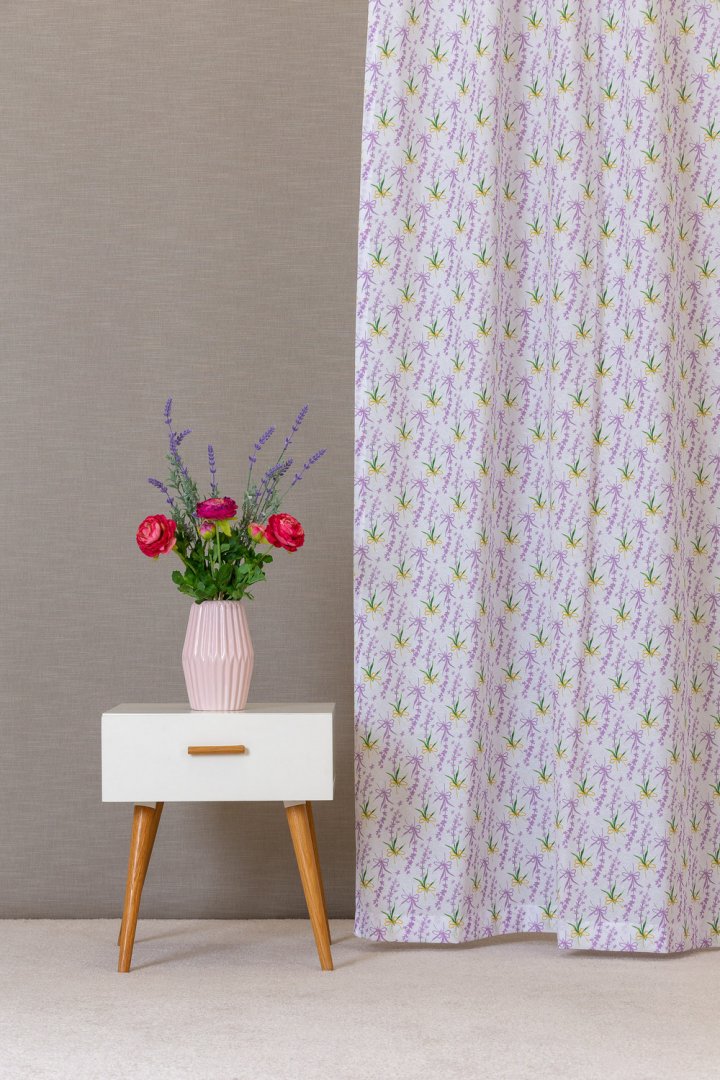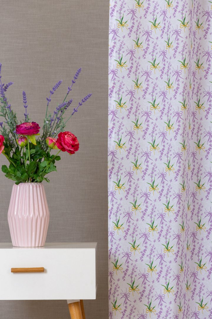 Színes masnikkal díszített dekorfüggöny. Súlya: 175g/m2