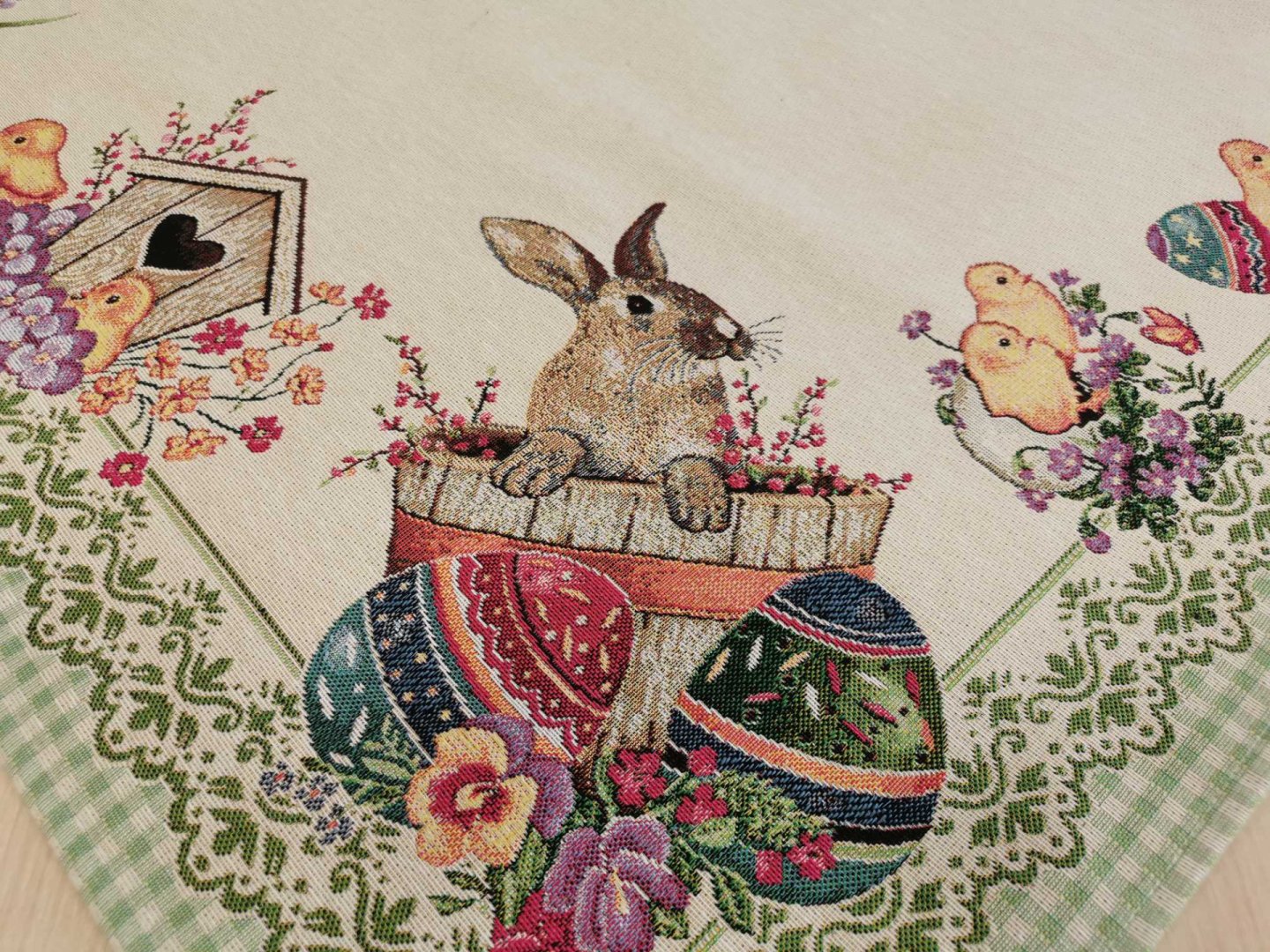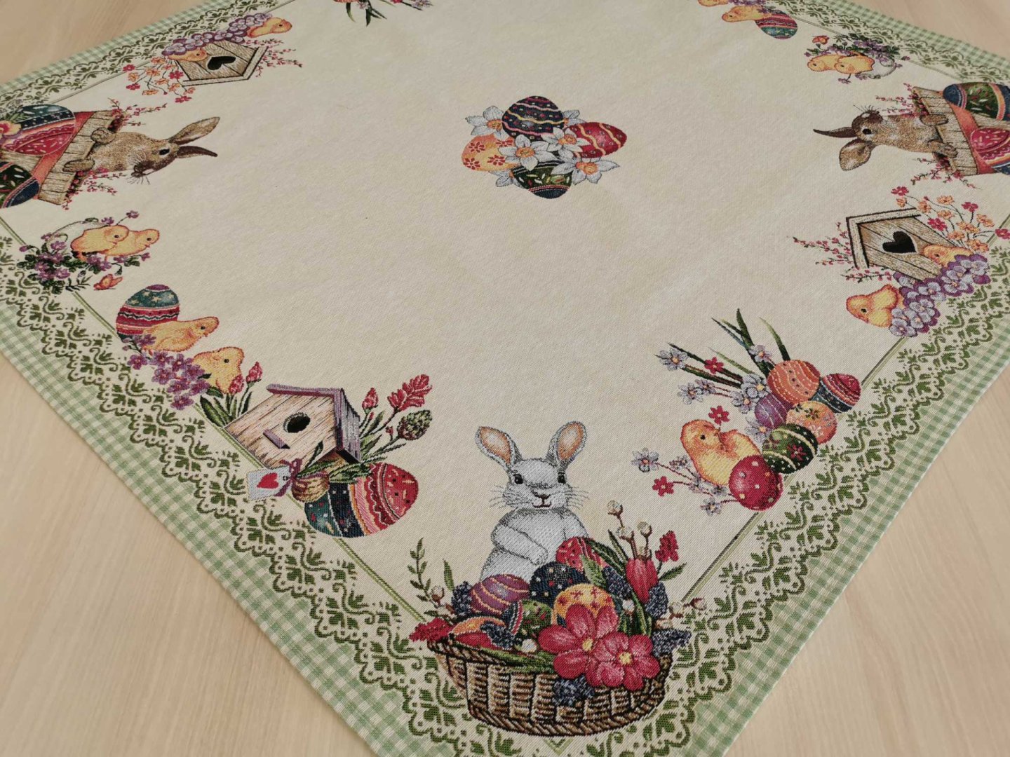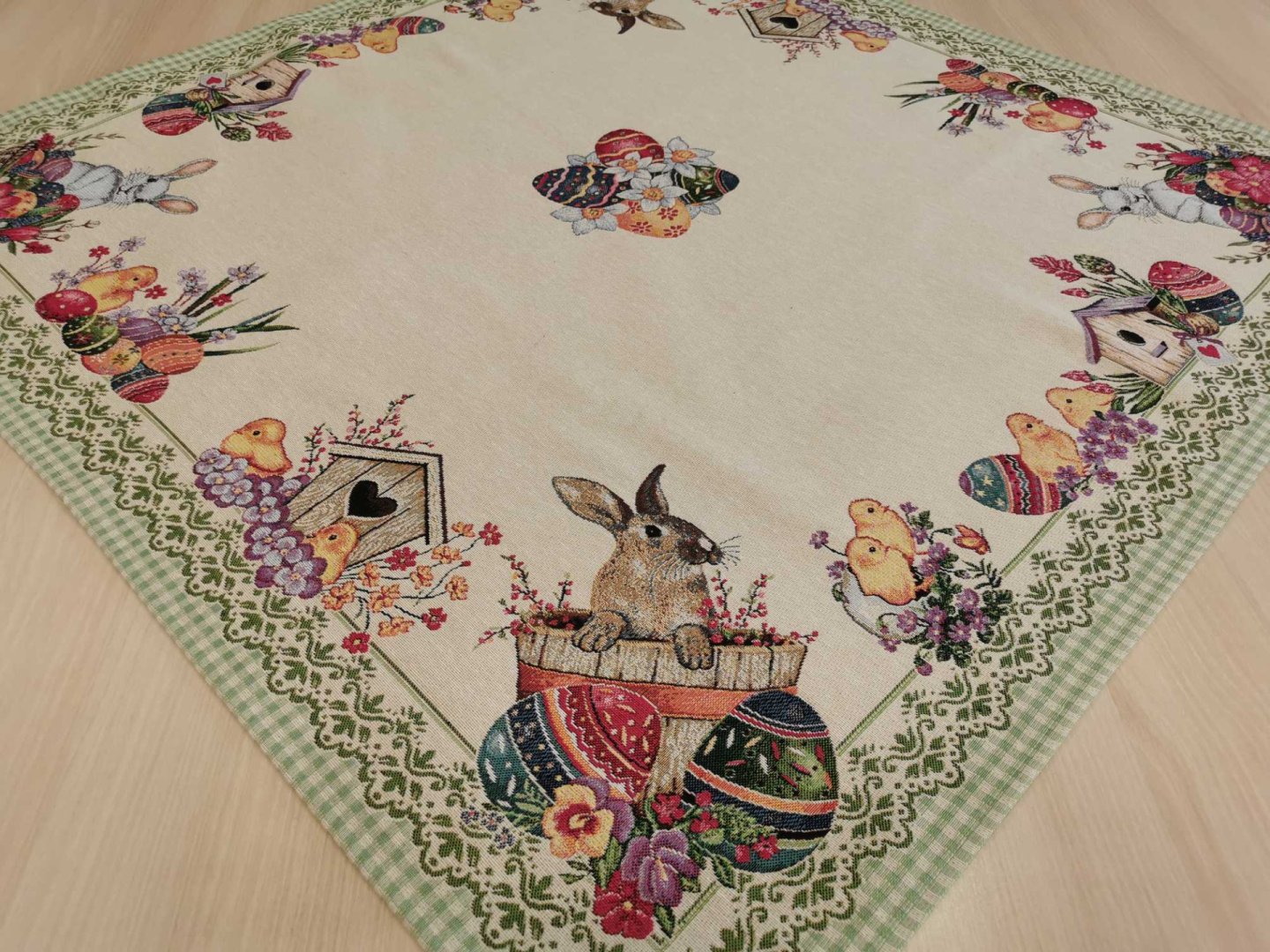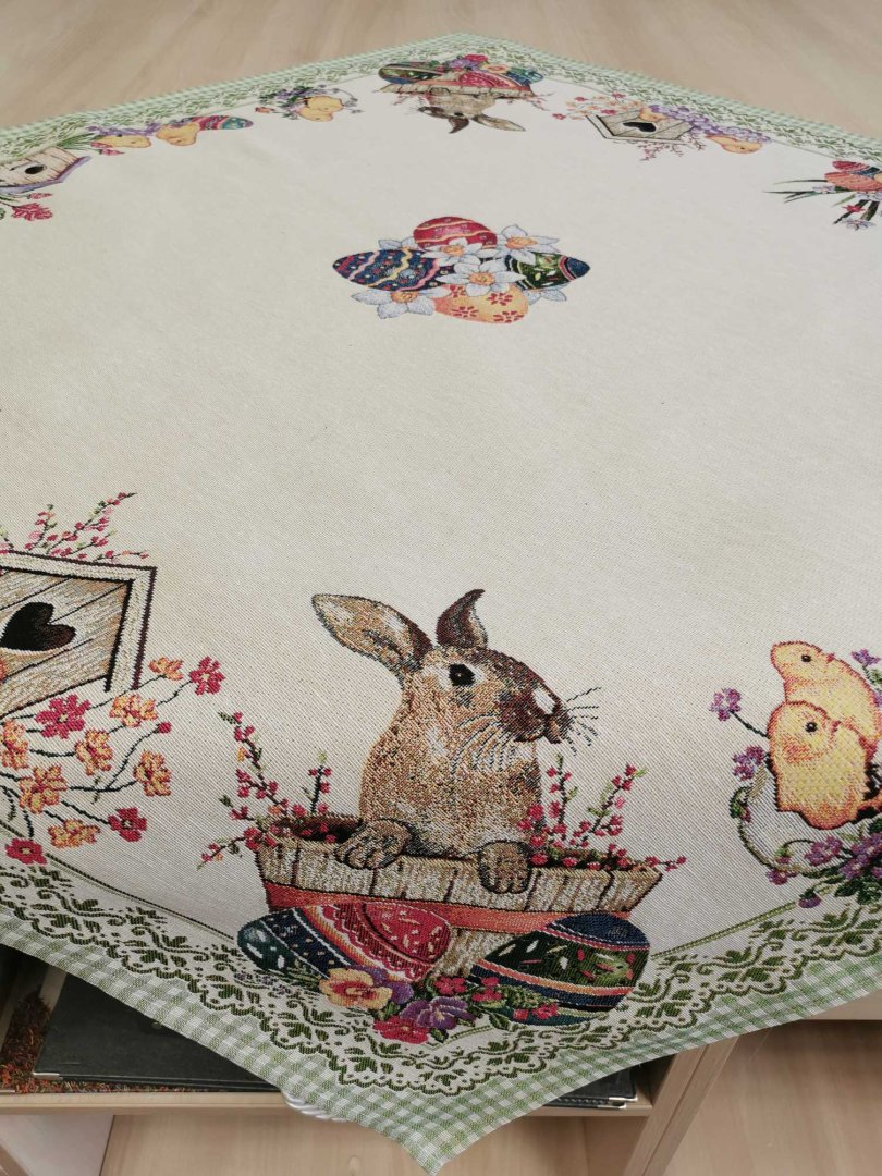 Húsvéti nyuszis 100 cm x 100 cm -es asztalközép, vastag goblein szerű anyagból.
