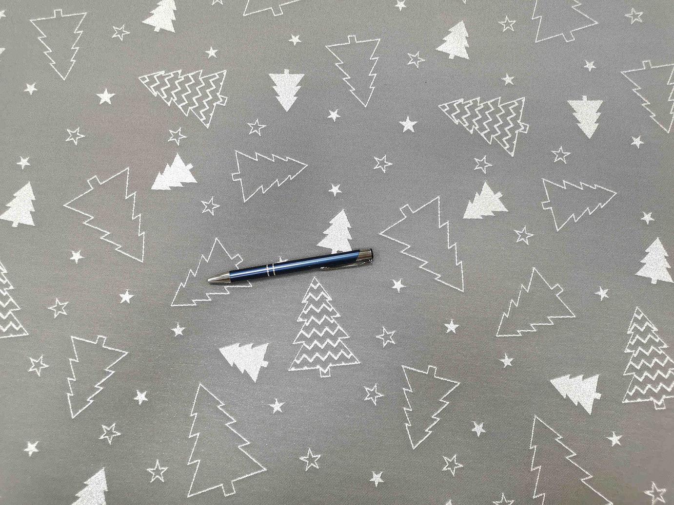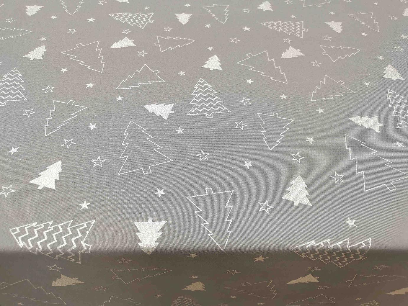Szürke alapú, ezüst fenyőkkel díszített, vastag,teflonos (mindkét oldala használható), igazi minőségi karácsonyi asztalterítő.